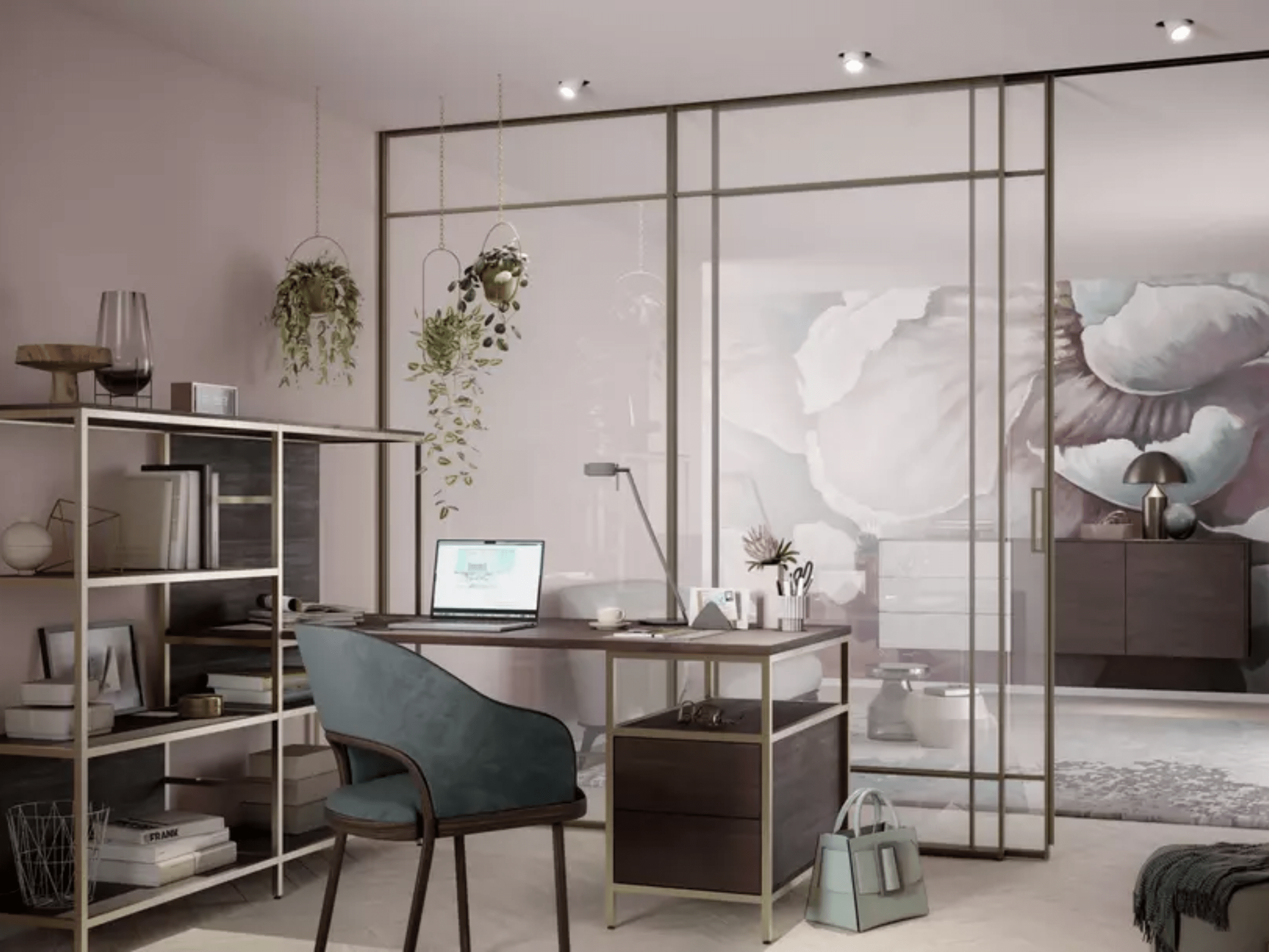 Dank Schiebetüren sind funktionale Home-Office-Arbeitsplätze in Nischen komfortabel zugänglich und lassen sich schnell verbergen.