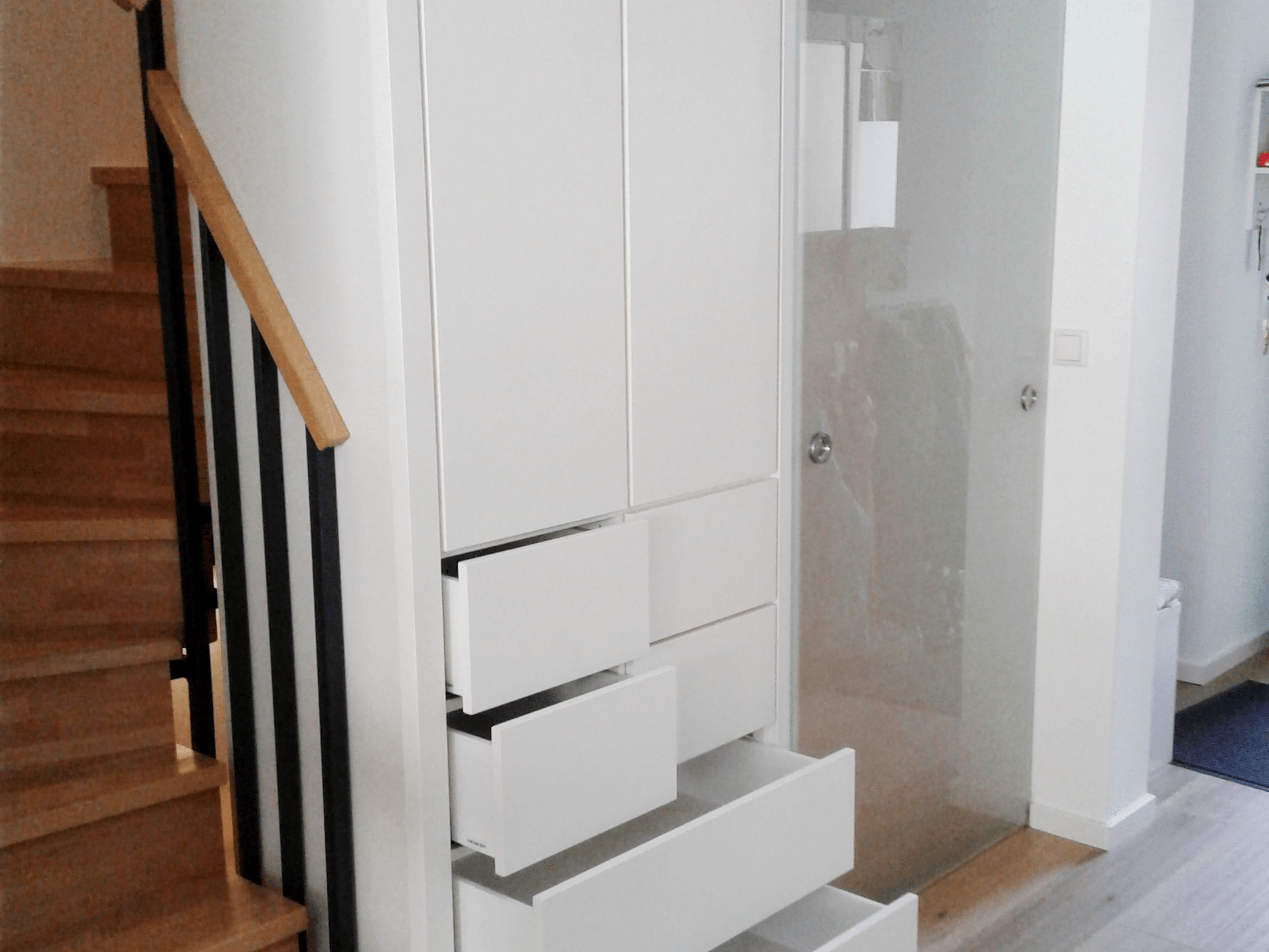 Als Kombination aus feststehenden Elementen und Schiebtüren sorgen Sie für neuen Schwung und Ordnung im Eingangsbereich. Kombiniert mit Sitzbank, Spielelement oder Schuhschrank entsteht ein multifunktionaler Bereich, der jedem beim Betreten des Hauses ein Lächeln auf das Gesicht zaubert.